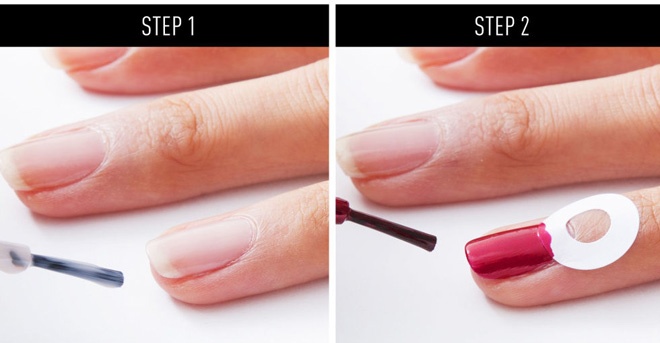 | Bắt đầu bằng cách chuẩn bị 1 lọ sơn bóng, 1 lọ sơn đỏ, 10 hình tròn nhỏ bằng giấy bìa cứng, 1 ít keo trong và 10 hạt đá thủy tinh trong suốt. Phết lớp sơn bóng lên toàn bộ móng. Để khô hoàn toàn rồi dùng giấy bìa cứng hình tròn che bớt phần góc móng. Phết thêm lớp sơn màu đỏ lên, bỏ qua phần bao phủ bởi miếng bìa như ảnh hướng dẫn. |