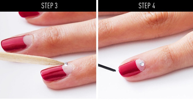 | Dùng tăm chấm 1 ít keo vào móng. Sau đó gắn hạt thủy tinh lên để hoàn tất 1 kiểu nail thật đẹp mắt và nổi bật. |