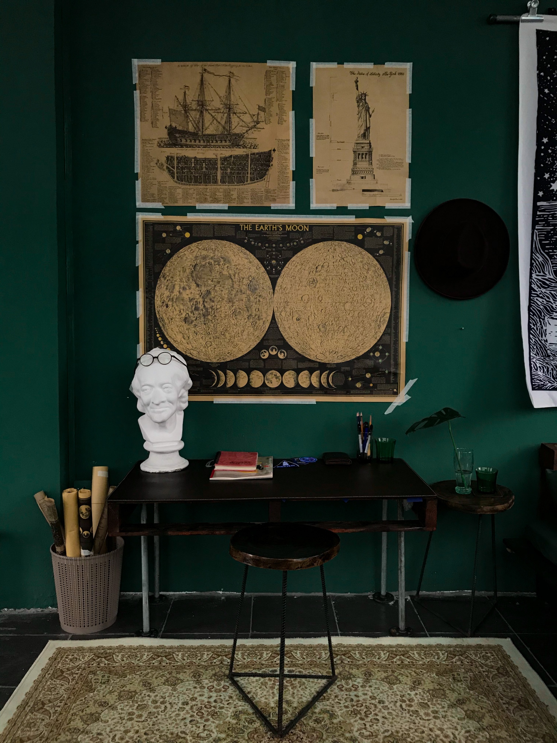 Ở bàn làm việc, anh trải thêm một mảnh vải họa tiết hoa nhí hơi hướm vintage.