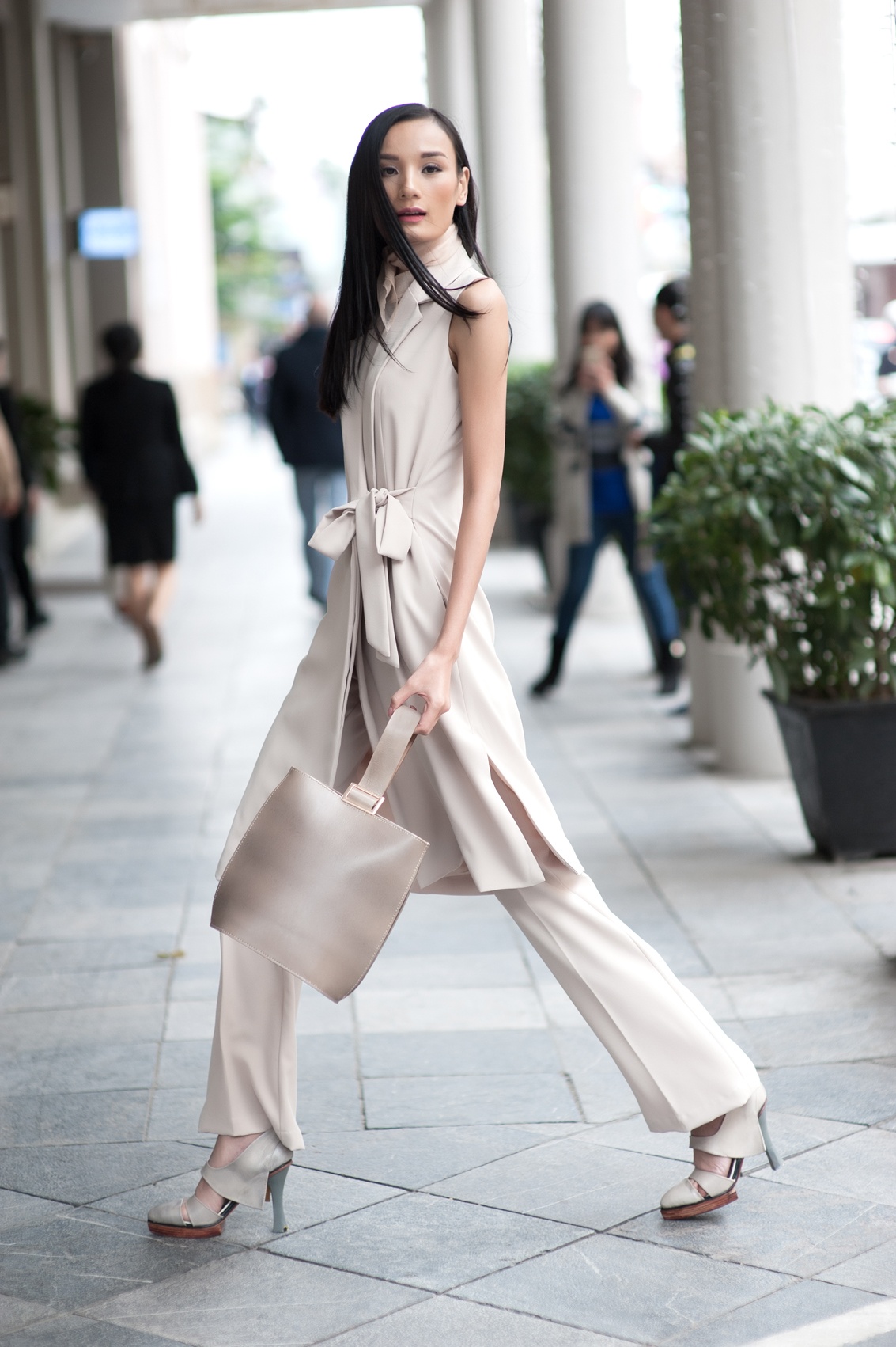 | Bộ cánh đầu tiên có gam màu trắng kem, đường cắt thanh thoát. Thiết kế dạng suits phù hợp vóc dáng mảnh mai của người mặc. Người mẫu Next Top Model phối giày và túi xách ton sur ton. |