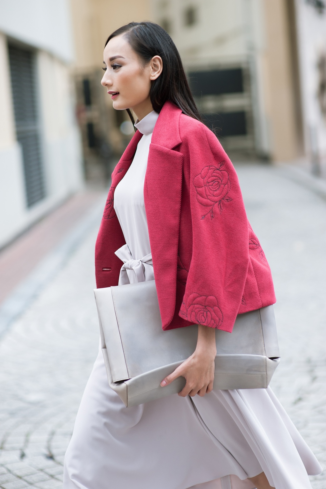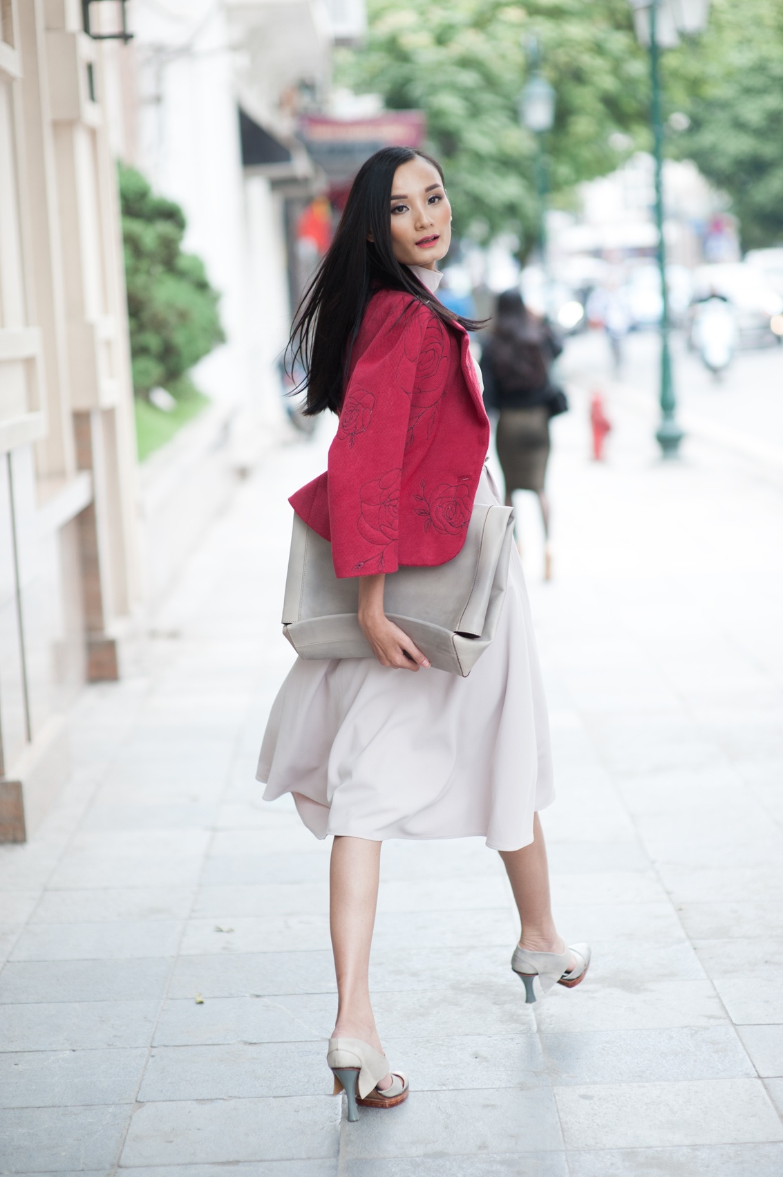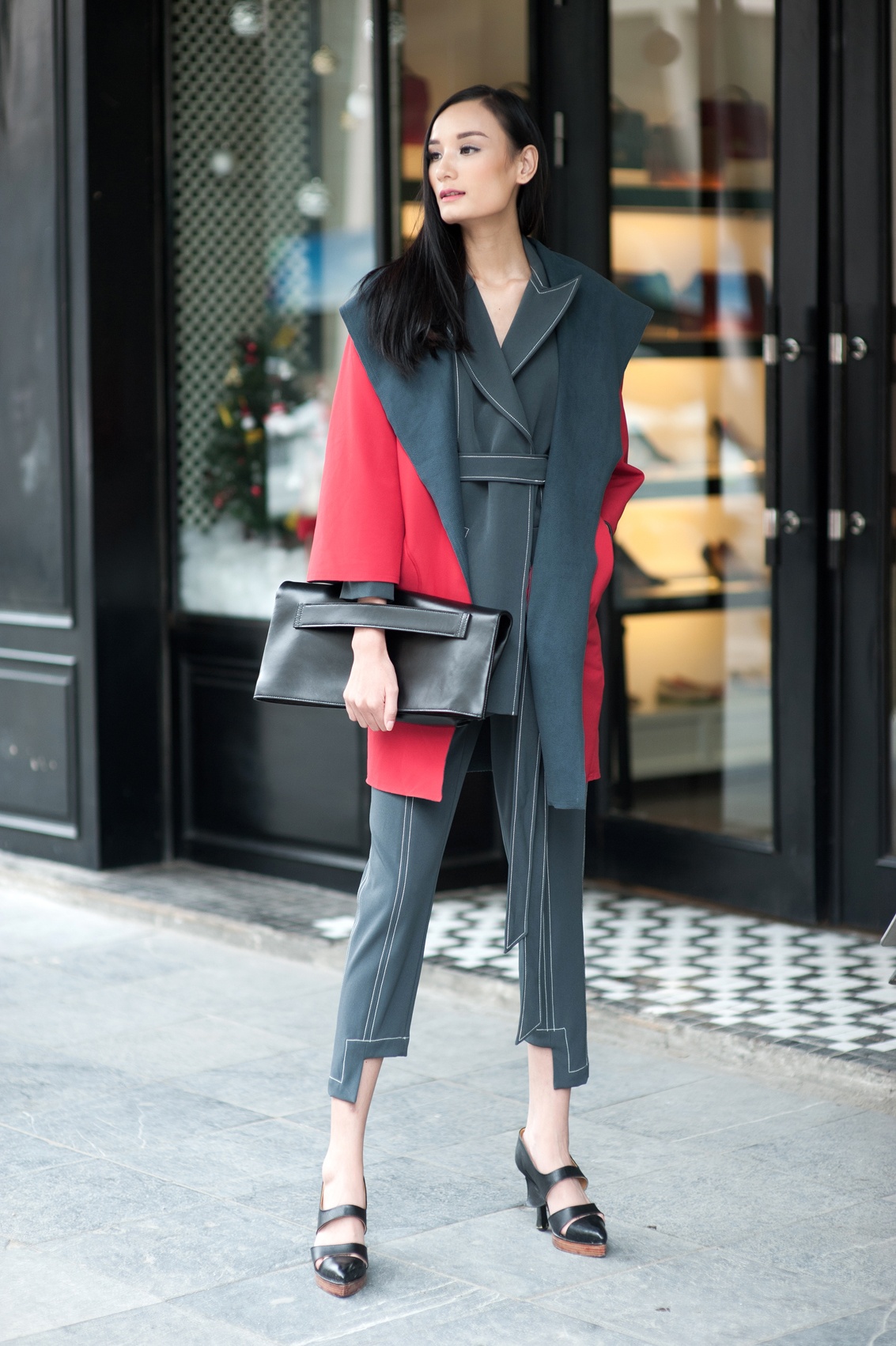 | Trang phục nhiều lớp phù hợp với bạn gái có dáng mảnh như Lê Thúy. Bộ cánh trong ảnh vận dụng gam màu tối, áo khoác đỏ bắt mắt làm điểm nhấn. Clutch hiện đại đồng điệu cùng set đồ. |