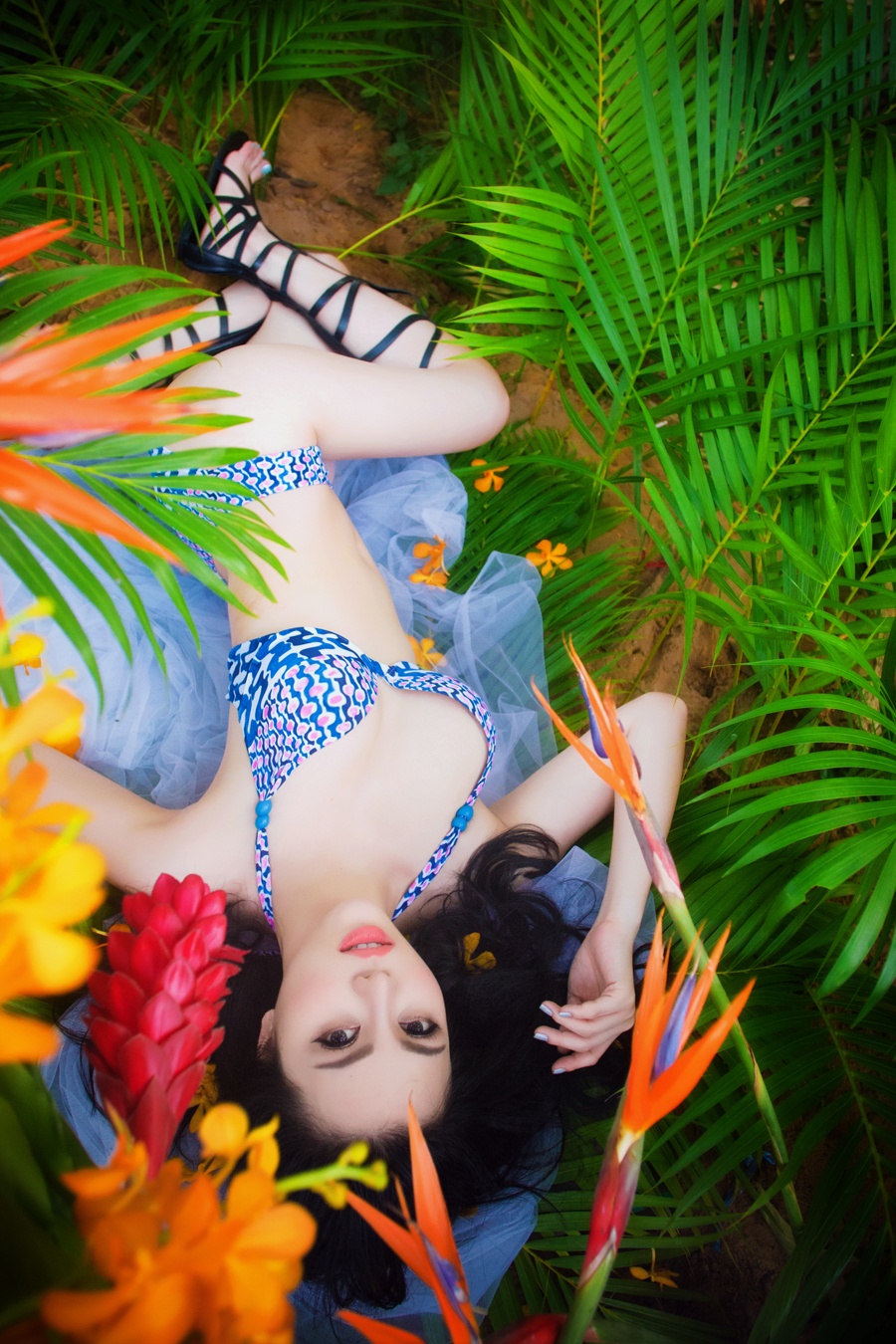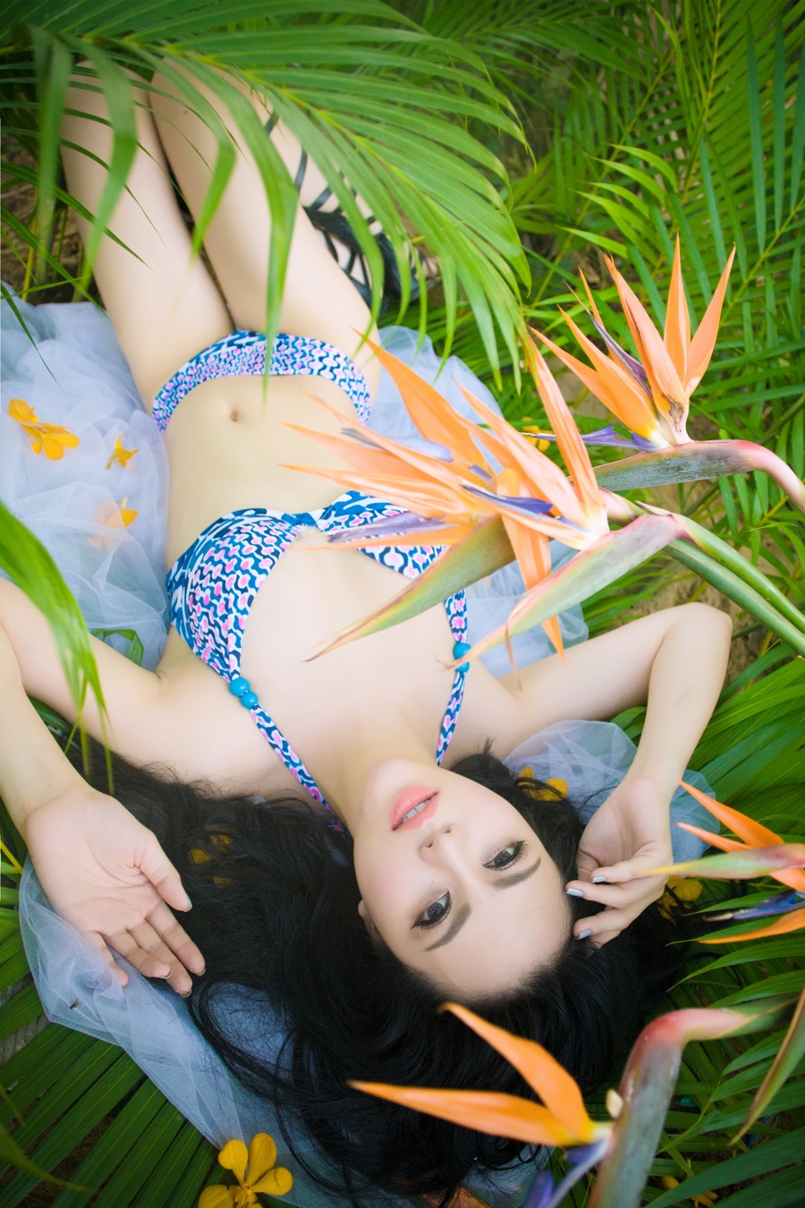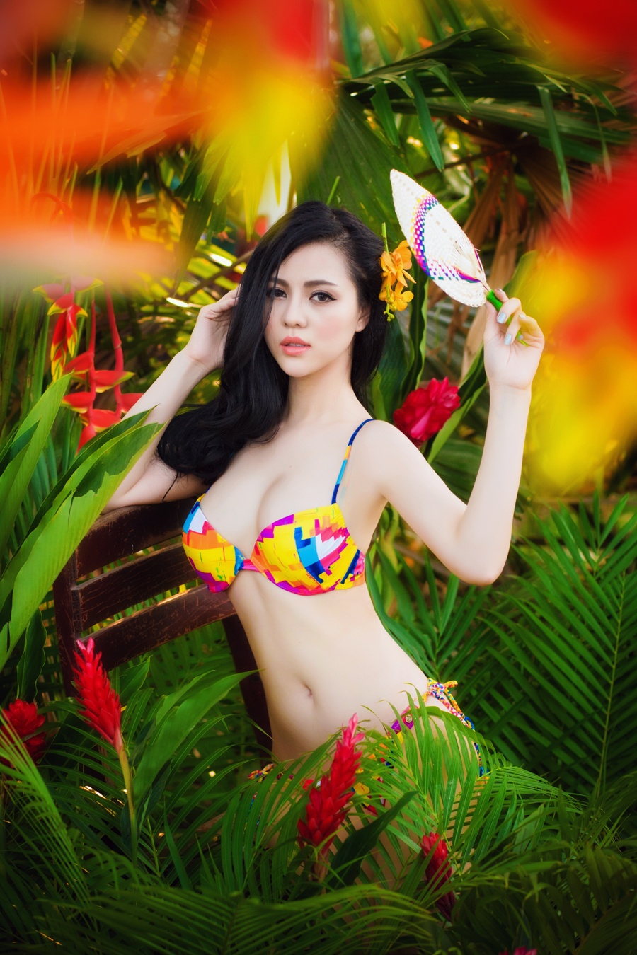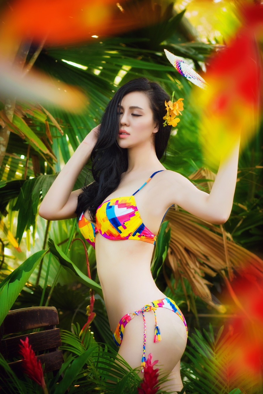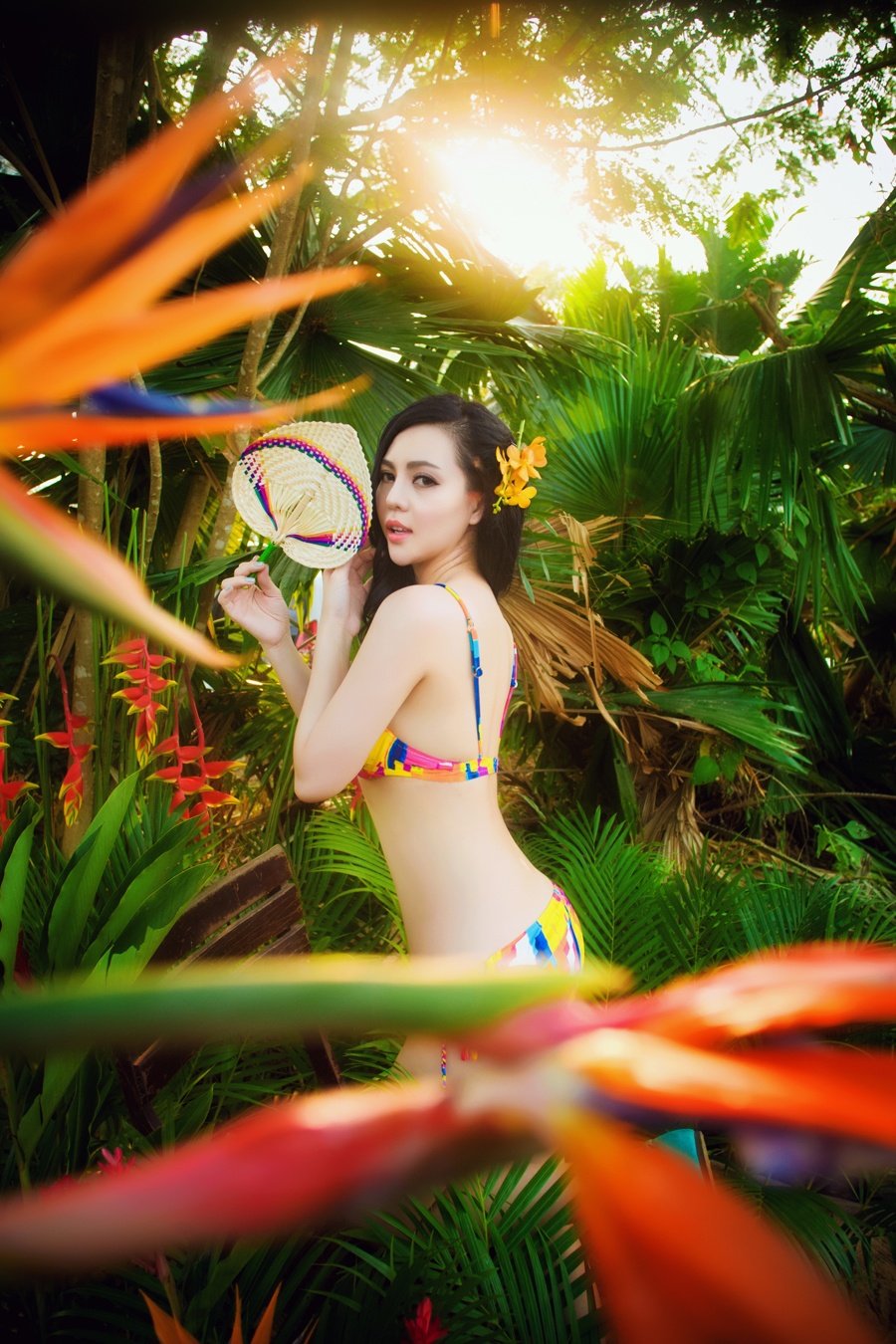 | Trong bối cảnh chụp tại vườn cây, có sắc màu nhiệt đới, nữ người mẫu không ngần ngại phô diễn những đường cong gợi cảm. |