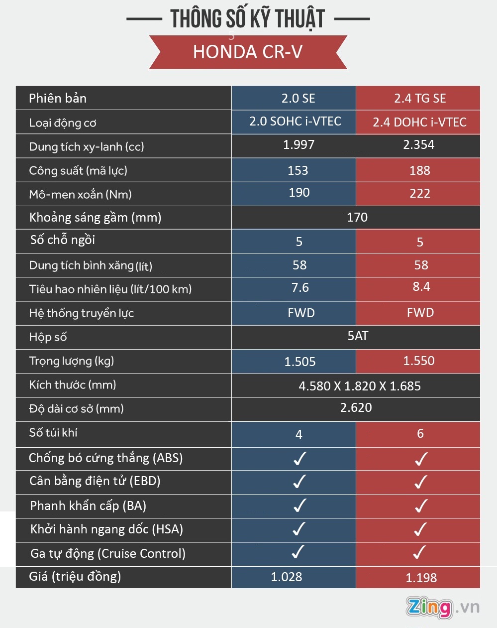 Honda CR-V là cái tên được nhiều người quan tâm trong phân khúc crossover cỡ trung tại Việt Nam. Xe được lắp ráp trong nước với 3 phiên bản. Bản 2.0 lít có công suất 153 mã lực và 190 Nm mô-men xoắn, mức giá 1.028 triệu đồng. Phiên bản CR-V 2.4AT có giá 1.178 triệu đồng và cao cấp nhất là bản CR-V 2.4AT TG giá 1.198 triệu đồng.