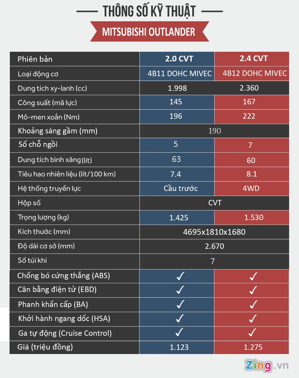 Outlander trang bị hàng loạt công nghệ an toàn cao cấp như 7 túi khí (phiên bản 2.0 CVT và 2.4 CVT), ABS, EBD, cân bằng điện tử ASC hay khởi hành ngang dốc HAS.