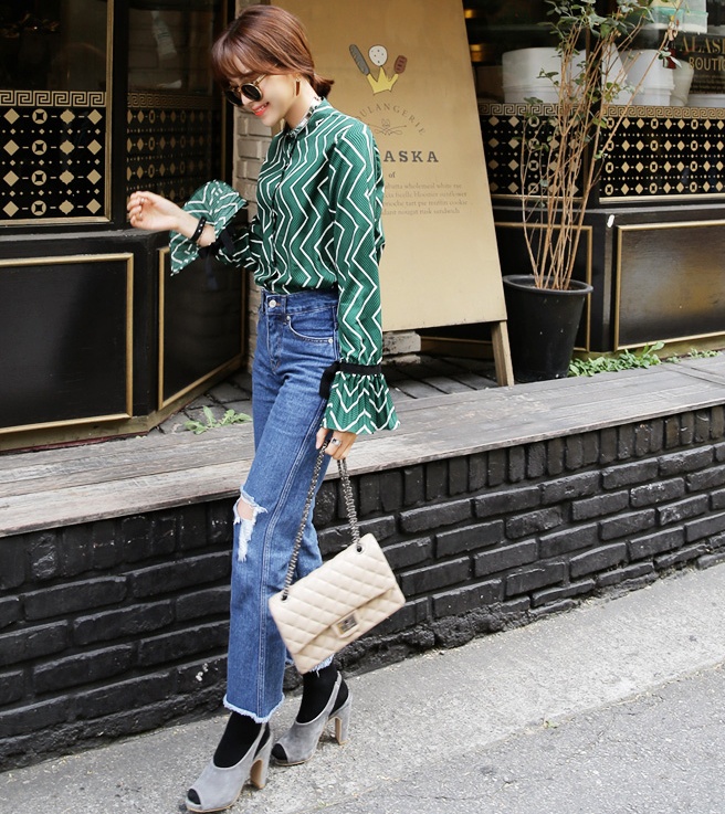| Cách kết hợp sơ mi tay loe và họa tiết rất thích hợp với tiết trời xuân. |