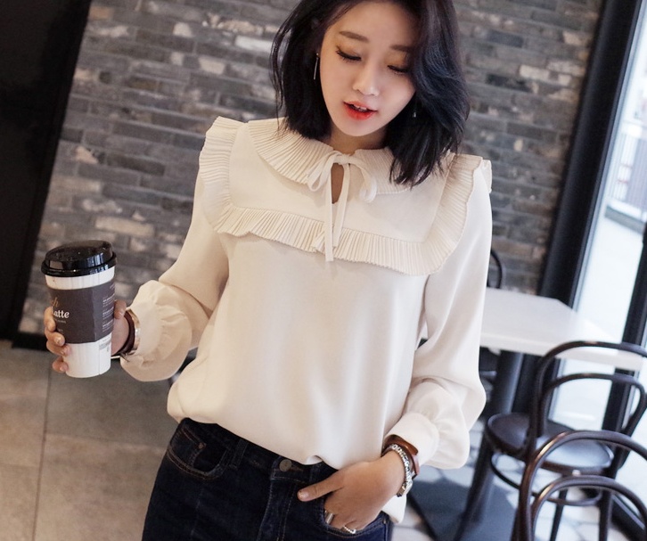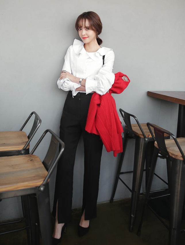 | Kiểu sơ mi trắng với cổ bèo xòe mềm mại rất phù hợp với dân công sở. |