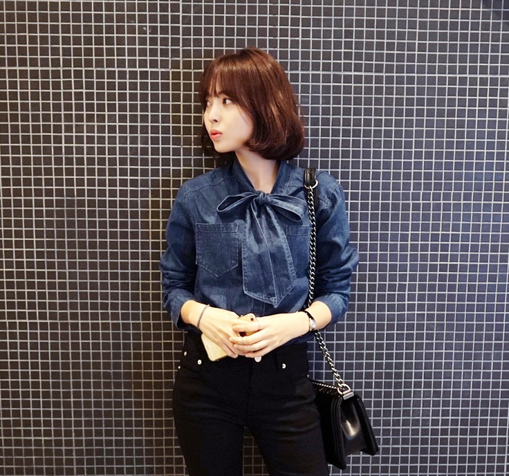 | Cách kết hợp giữa chất liệu denim và thắt nơ rất thu hút. |