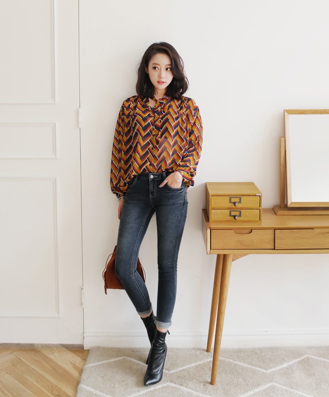 | Phong cách thời trang đơn giản với quần skinny sẽ trở nên thu hút hơn với áo sơ mi màu sắc hoa văn rực rỡ. |