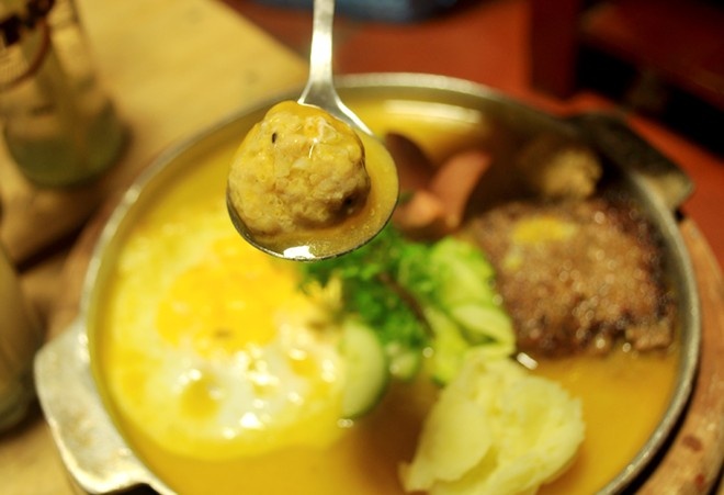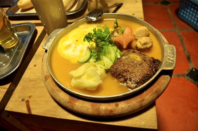 | Món ăn là sự kết hợp giữa bánh mì pate truyền thống với bánh mì bít tết của phương Tây, có thêm nước sốt sánh. Đặc biệt, tất cả đều được đun nóng và giữ nhiệt trên chảo gang nên rất dễ khiến khách có cảm giác ngon miệng, thèm ăn trong mùa đông. |