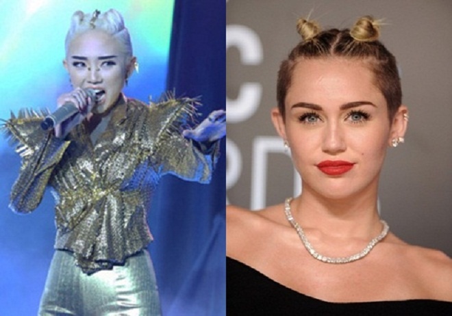 | Nếu ai là fan của hai cô ca sĩ này không khó nhận ra nhiều pha đụng hàng trong kiểu tóc. Trong lần "xuống tóc" đầu tiên khi quyết định từ bỏ hình ảnh dễ thương của cô "công chúa tóc xù", Tóc Tiên lựa chọn kiểu tóc pixie cá tính. Trước đó, Miley cũng lựa chọn style tóc pixie khi quyết định chuyển sang phong cách nổi loạn. |