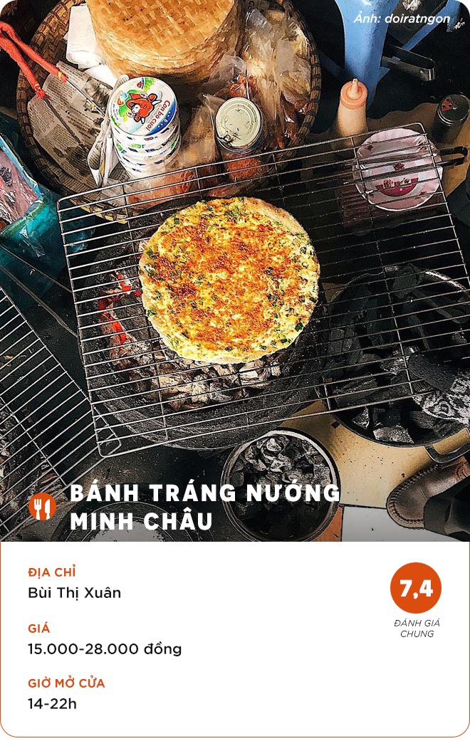 Bánh tráng nướng giòn, đồ ăn kèm phủ kín lớp vỏ là những nhận xét của nhiều thực khách về chất lượng món tại đây. Menu gồm nhiều hương vị cho bạn chọn lựa như gà - pate, thập cẩm, gà - phô mai, gà - xúc xích...