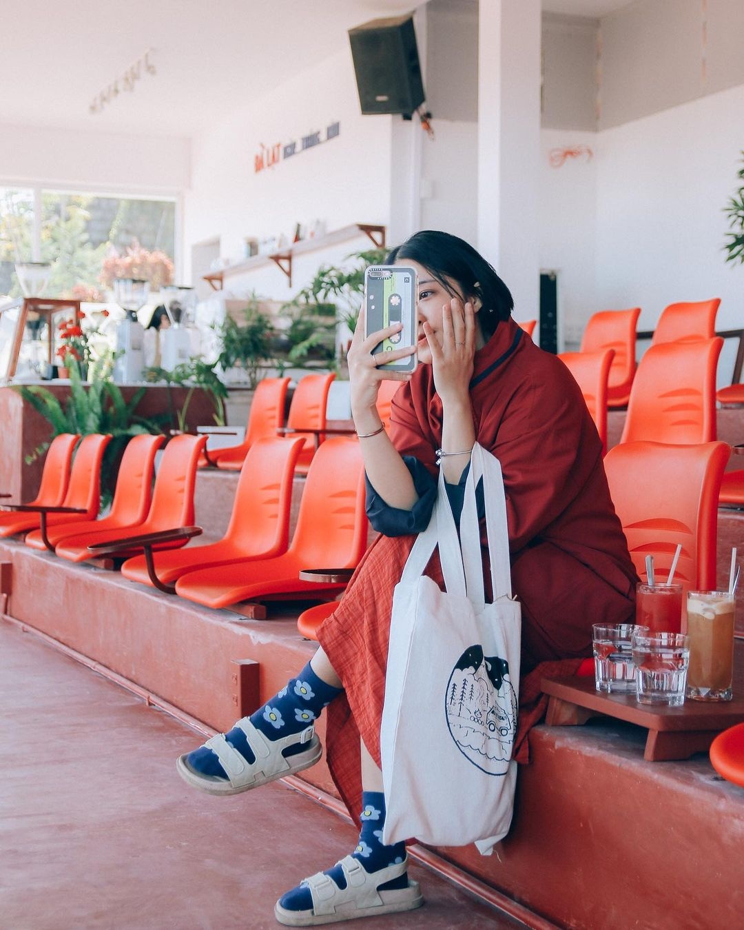 Thảo Duyên: "Không đi theo lối kiến trúc rập khuôn của những quán cà phê khác, Orimi như chú chim hạt nằm an vị giữa khoảng đồi yên bình. Ở đây, bạn có thể săn mây hay ngắm hoàng hôn về chiều. Nước khá ổn vì được chăm chút từ nguyên liệu, cách pha chế đến decor".