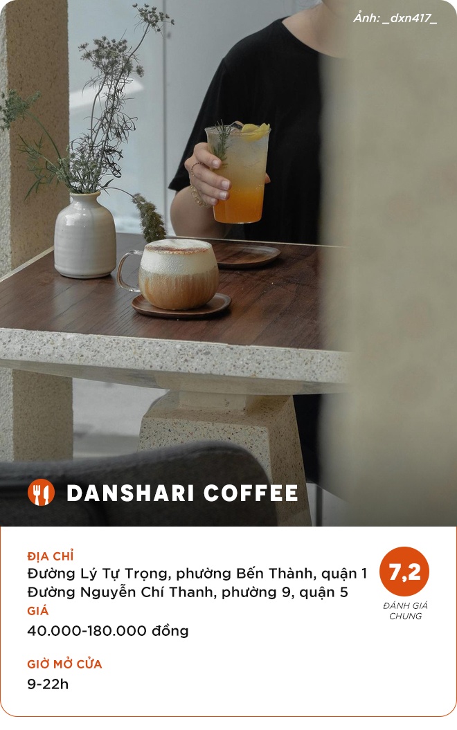Dicaphekhong: "Khi đặt chân tới Danshari, tôi cảm nhận rõ phong cách tối giản trên từng chi tiết. Quán nằm giữa trung tâm của khu vực Chợ Lớn. Không gian rộng rãi với 2 tầng. Thích nhất là khoảng sân trải sỏi, nhiều cây. Bên ngoài là bức tường trắng nổi bật. Quán thích hợp để làm việc và tụ họp cùng bạn bè.
