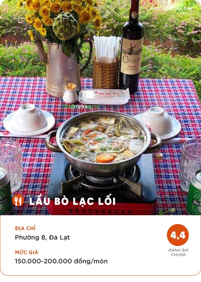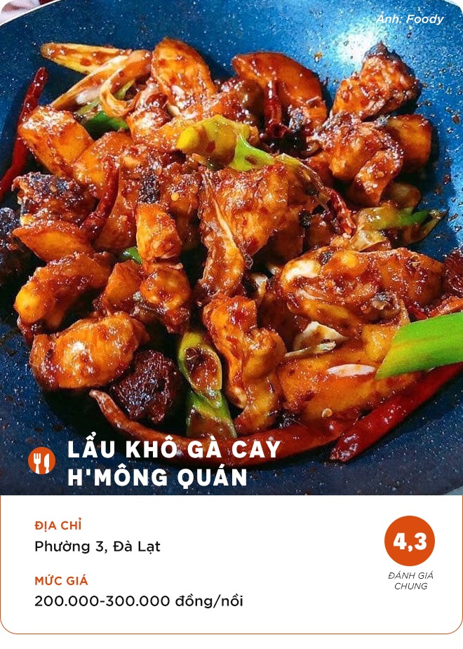 Tổng quan: Quán lẩu với món ăn tên lạ từng gây nhiều chú ý ở Đà Lạt. Không gian quán rộng rãi, thích hợp cho nhóm bạn ăn nhậu. Đồ ăn ngon, đặc biệt là món gà khô xào cay. Một điểm trừ có thể nhiều người không thích là quán bật nhạc khá ồn, có thể gây khó chịu.