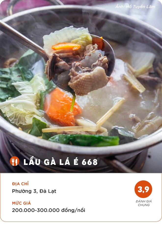 "Mình khá tò mò vì sao nhiều người bảo nên thử lẩu gà lá é khi tới Đà Lạt. Cá nhân mình thấy nước dùng hơi nhiều mỡ, khá ngấy. Một phần lẩu có gà, măng, nấm ăn kèm lá é, bún. Hương vị chấm 7/10. Quán chứa được khoảng 50-60 người. Chỗ này còn có gà nướng, lòng xào nấm" - Vy Lam Nguyen Tuong