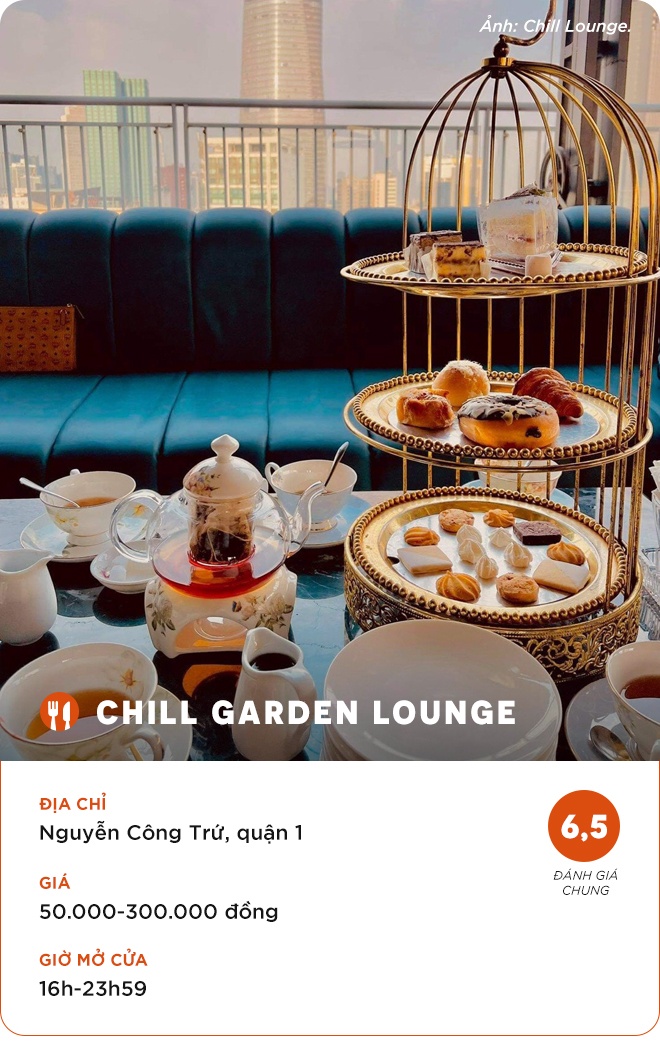 Nằm tại trung tâm quận 1, Chill Garden Lounge sở hữu tầm nhìn lý tưởng hướng ra Bitexco. Thiết kế lồng chim khổng lồ cũng là điểm nhấn trong không gian dùng bữa ở ở đây. Bạn có thể vừa ngắm hoàng hôn vừa thưởng thức trà chiều và chiêm ngưỡng khung cảnh thành phố lung linh về đêm.