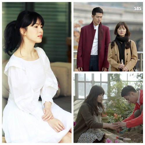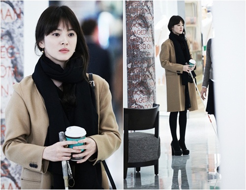 Vào vai tiểu thư mù giàu sang, Song Hye Kyo được tạo hình thời trang theo phong cách dịu dàng, nữ tính nhưng toát lên vẻ sang trọng quý tộc. Item được cô diện nhiều nhất là áo choàng dài, khăn quàng cổ đơn sắc và váy len liền thân. Mái tóc gợn sóng mềm mại càng làm bật lên sức hút, vẻ hoang hoải thoảng nét u buồn của nhân vật.