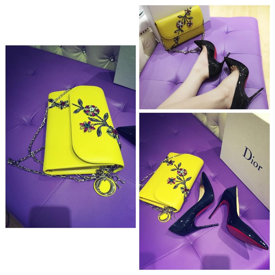 | Trong tuần qua, Ngọc Trinh tiếp tục khoe mẫu túi Dior và đôi giày hiệu mà cô phải chờ hơn một tháng mới mua được. Túi Dior Jaune Vif màu vàng đính đá này có giá vào khoảng 80 triệu đồng, còn đôi giày màu đen hiệu Christian Louboutin có giá gần 33 triệu đồng. |