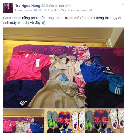 | Mới đây, Trà Ngọc Hằng khoe loạt đồ cô mới mua để chơi thể thao. Trà Ngọc Hằng khoe các bộ đồ "cực chất" và mua đến 6 đôi giày. Điều đặc biệt là cô mua sắm với tốc độ chỉ trong một tiếng đồng hồ. |