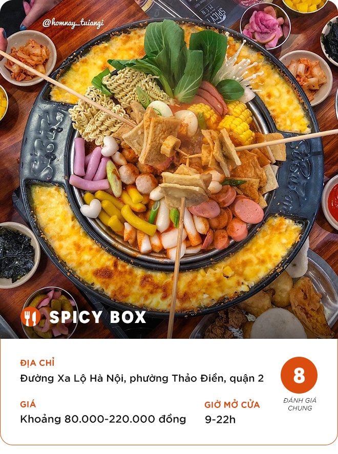 Anh Vân: "Nhà hàng là một trong những địa điểm buffet tokbokki ngon với giá vừa phải. Với khoảng 129.000 đồng/người chưa VAT, bạn sẽ được ăn bữa lẩu tokbokki đã đời. Món lẩu còn có thêm thịt bò, xúc xích, chả cá, rau, mì, nấm. Nếu muốn thưởng thức vòng bắp phô mai bao quanh, bạn phải gọi riêng. Sốt pha lẩu có thể chọn tự pha hoặc nhờ nhân viên".