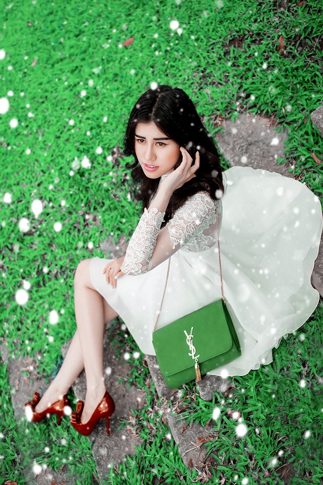 Bộ đầm trắng với thiết kế hoàn hảo sẽ đẹp hơn khi bạn chọn điểm nhấn là chiếc túi xinh gam màu lá thông. |