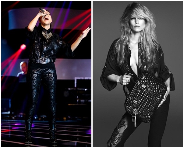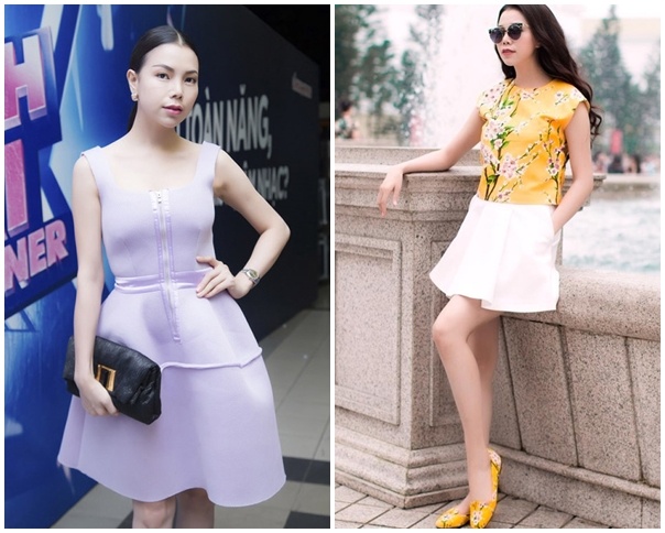 Trong một sự kiện diễn ra giữa năm 2014, "yêu nữ hàng hiệu" khiến khán giả choáng ngợp khi diện váy Fausto Puglisi trị giá 50 triệu đồng cùng túi xách LV xa xỉ (hình trái). Cô cũng thường xuyên dạo phố với những set trang phục hàng hiệu bắt mắt. Trong ảnh (bên phải) người đẹp diện áo váy ton-sur-ton màu vàng rực rỡ của thương hiệu Dolce & Gabbana có giá 2.000 USD (42 triệu đồng).