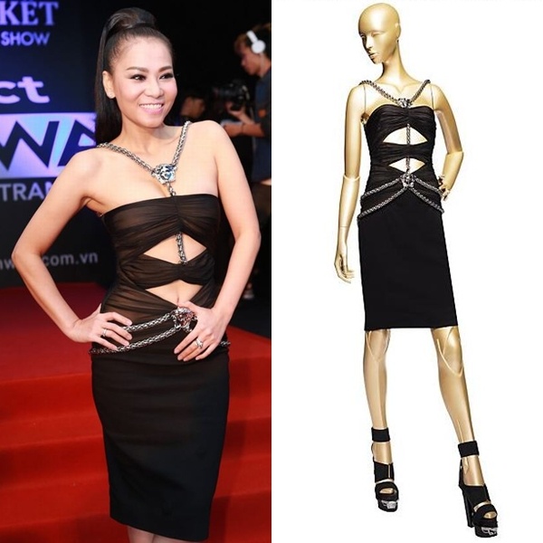 Cựu giám khảo The Voice gây chú ý trên thảm đỏ chương trình Project Runway Vietnam với mẫu váy Versace gợi cảm được bán với giá 4.625 USD (khoảng 97 triệu đồng). Thiết kế được cho là phù hợp với vóc dáng cân đối, tông màu đen tôn nét sang trọng. Thu Minh cũng từng tâm sự, cô may mắn khi có ông xã làm stylist, chuẩn bị trang phục mỗi khi xuất hiện trước truyền thông và công chúng.