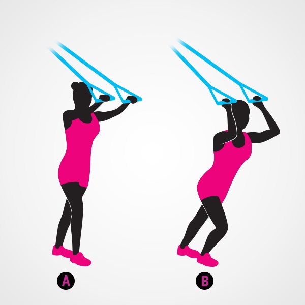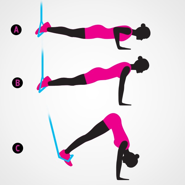 Bạn chuẩn bị trong tư thế hít đất chống đẩy, luồn hai bàn chân vào máy kéo có tay cầm (tay cầm cách mặt đất khoảng một bước chân lớn). Cơ thể bạn tạo thành một đường thẳng từ đầu gối đến vai.