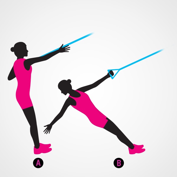 Như các động tác trước, bạn đối mặt với máy kéo có tay cầm, tay trái cầm dây kéo về phía ngực, tay phải duỗi ra song song với dây kéo.