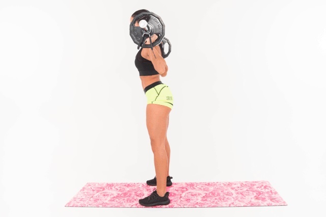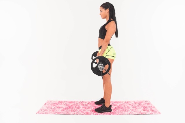 Bạn dùng hai tay giữ một quả tạ cho vuông góc với mặt đất. Sau đó, bạn đứng với chân rộng ngoài vai và góc hai mũi chân hướng ra phía ngoài khoảng 45 độ.