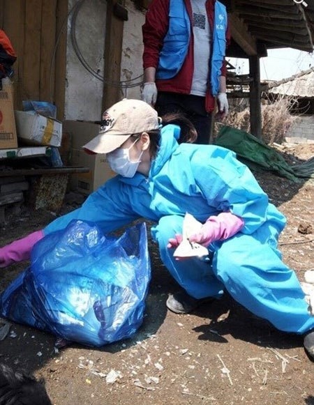 Nhìn vào bức ảnh được thành viên của hội từ thiện chia sẻ, người ta thấy Song Hye Kyo đang chăm chỉ nhặt rác dưới trời nắng. Cô mặc bộ đồ lao động, bịt khẩu trang và miệt mài làm việc, không hay biết có người chụp ảnh.