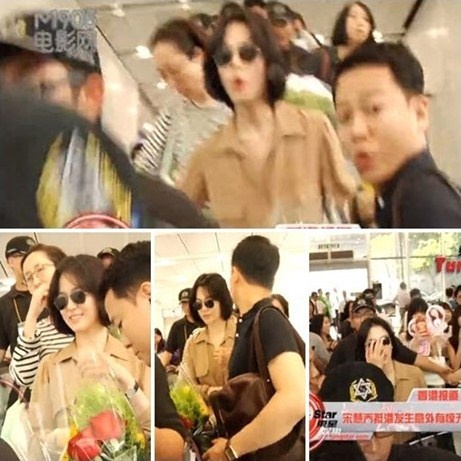 | Hàng trăm người đuổi theo Song Hye Kyo khi cô đang đi thang máy cuốn tại Hong Kong khiến thang bị hỏng đột ngột. |