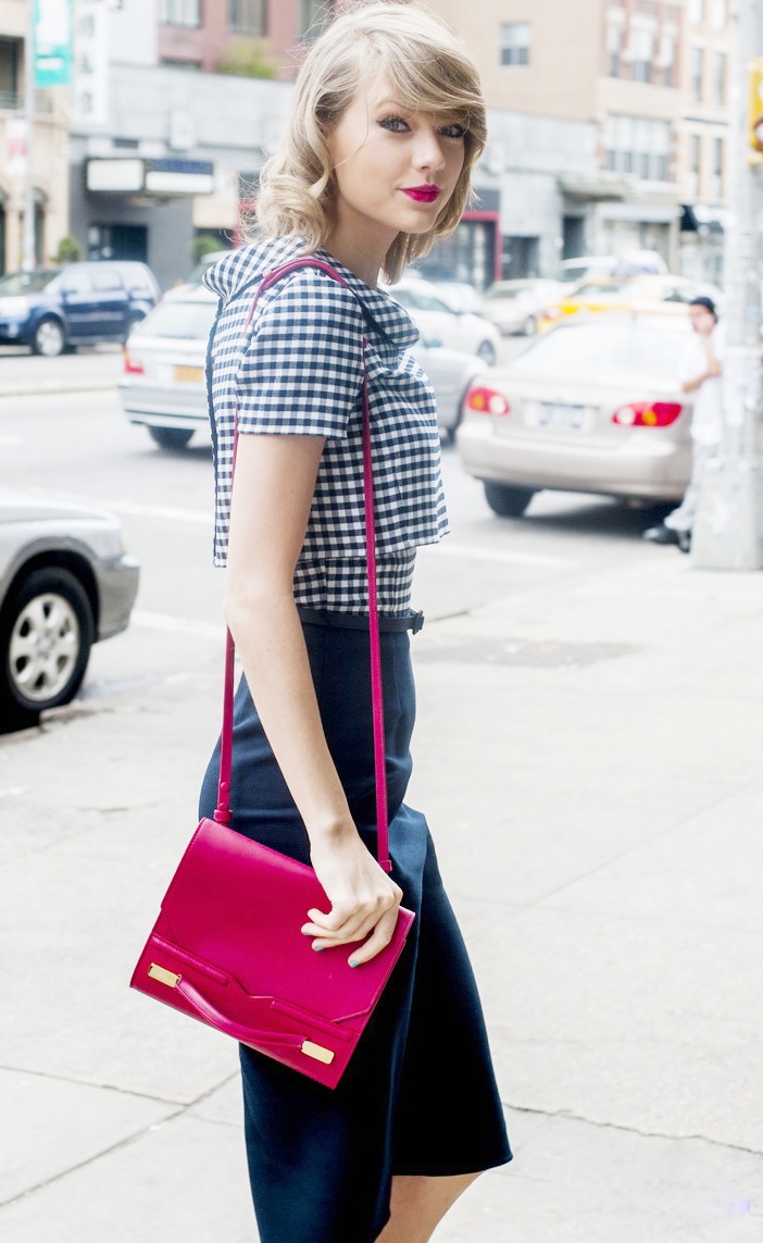 Các kiểu túi xách hộp cứng, kiểu dáng vuông vắn luôn nằm trong tầm ngắm của Taylor Swift.Với mẫu túi này, cô dễ dàng mix nó kèm với trang phục dạo phố hay dự tiệc.