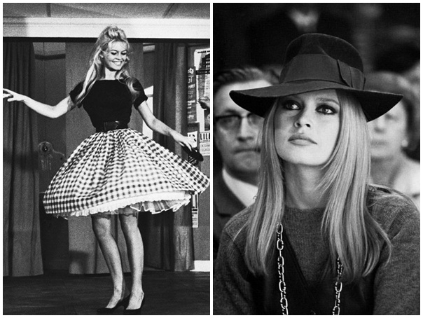 Brigitte Bardot có công lăng xê mốt áo triết eo thon, dáng quần búp ống và váy suông. Phong cách hòa trộn tuyệt vời giữa cổ điển và hiện đại của cô khiến những bộ cánh tưởng nhàm chán mà kỳ thực cuốn hút vô cùng. Hình ảnh thời trang của B.B gắn liền với mốt áo tắm bikini gợi cảm và phóng khoáng. Bằng ngoại hình đầy đặn, cô đào tóc vàng đã làm mới bikini với vẻ nóng bỏng, khiêu khích và trông hấp dẫn hơn.