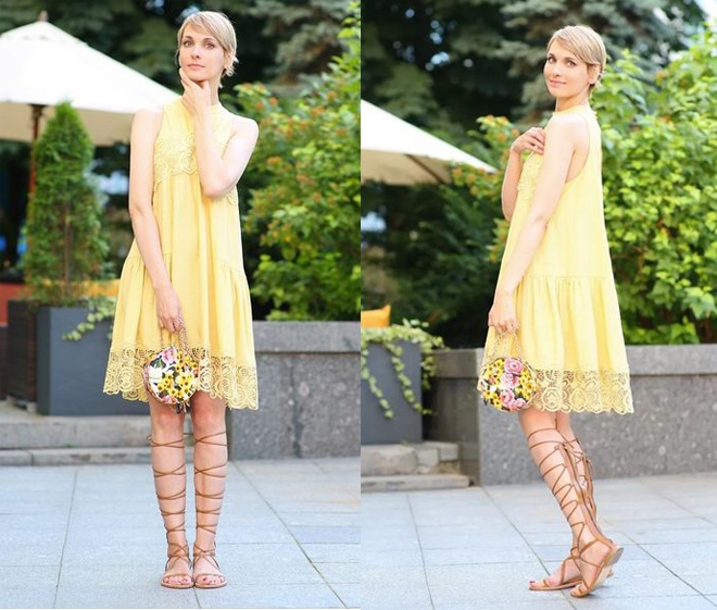 | 1. Mix váy áo over size với sandal chiến binh. Trang phục over size dù giấu eo bánh mì rất hiệu quả, nhưng lại dễ gây luộm thuộm cho nàng nấm lùn. Cũng khó chọn giày phù hợp với loại trang phục này. Để thật sành mốt như Liubov, bạn hãy bỏ qua các đôi giày phổ thông như đế xuồng, búp bê, cao gót… để kết thân với sandal chiến binh lạ mắt. |