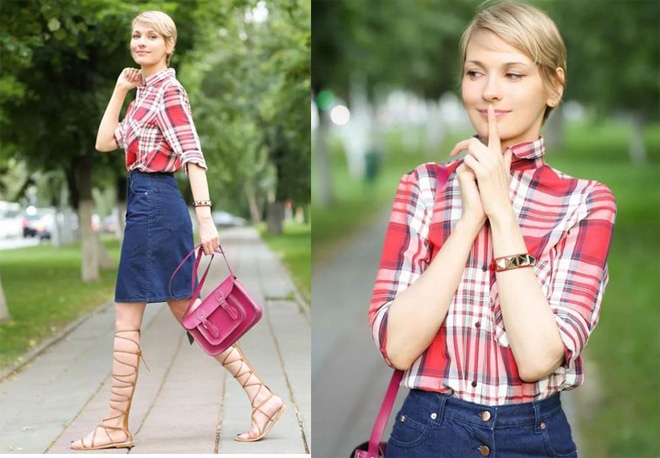 | 2. Sơ mi ca rô và váy ren, váy denim. Bạn đã bao giờ thử kết hợp sơ mi kẻ sọc ca rô, giày thể thao mạnh mẽ với chân váy ren mềm mại, nữ tính? Nếu chưa thì đây là gợi ý đáng cân nhắc để bạn sở hữu một set đồ dạo phố chất lừ và rất khó “đụng hàng”. |