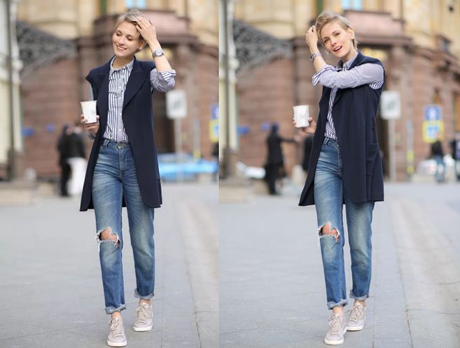 | 5. Tận dụng các xu hướng mới nhất. Để thật hợp thời trang, bạn không cần phải sắm toàn bộ váy áo đang vào mùa mốt. Mix các trang phục thường ngày như áo sơ mi, jeans rách với một chiếc áo khoác không tay dáng dài đang “hot” trong thu, bạn trông sẽ sành hơn hẳn. |