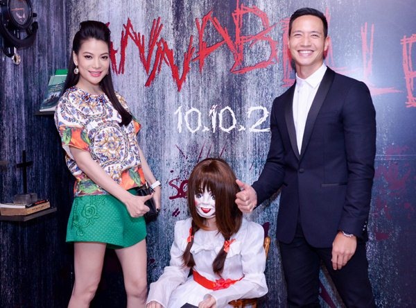 | Trương Ngọc Ánh mặc trang phục màu sắc nổi bật, họa tiết độc đáo tươi tắn sánh vai diễn viên Kim Lý – bạn diễn của cô trong phim Hương Ga tới rạp xem tác phẩm điện ảnh kinh dị Annabelle. |