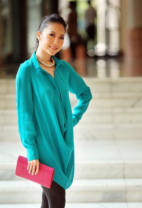 | Sơ mi lụa với màu xanh mát mắt giúp tăng vẻ thanh lịch cho Linh Nga. |