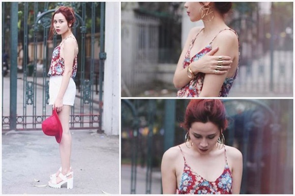 | Áo 2 dây hoa văn trẻ trung mix kèm trang phục trắng giúp Hương Giang ăn gian tuổi. |