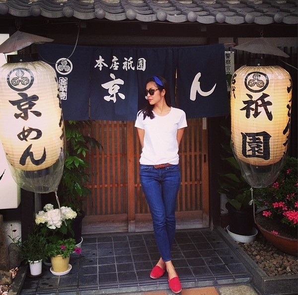 | Hà Tăng mix áo thun trắng với quần denim và giày vải rất cá tính. |