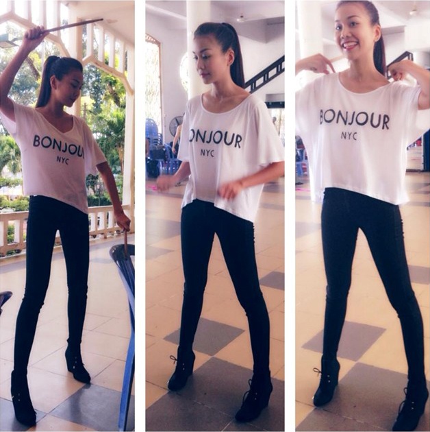 | Thanh Hằng nổi bật với quần skinny và áo thun lửng in chữ cá tính. |