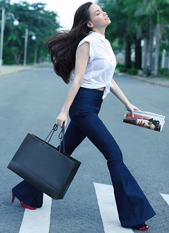 | Hà Hồ nổi bật với sơ mi trắng mix kèm quần loe đậm chất cổ điển. |