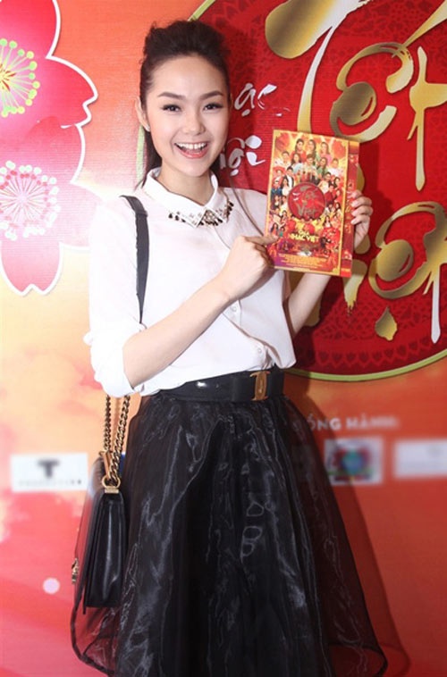 | Minh Hằng khoe vẻ nữ tính với mẫu áo sơ mi voan mix kèm chân váy midi. |