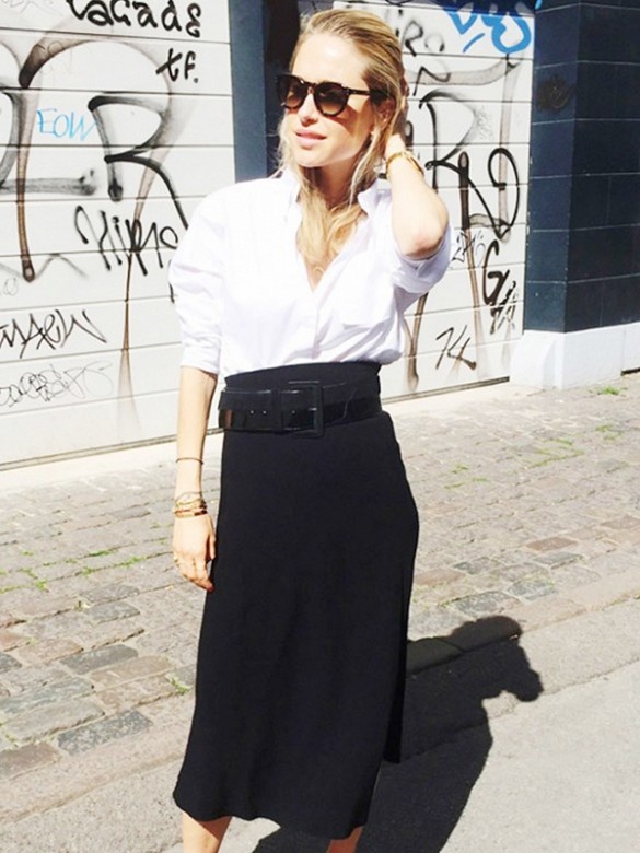 | Thái Hà trẻ trung với kiểu sơ mi trắng biến tấu crop top khi mix kèm váy xòe. |