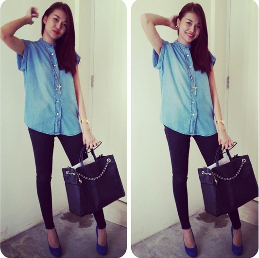 | Phương Linh sử dụng áo sơ mi màu xanh cổ điển cho phong cách denim on denim. |