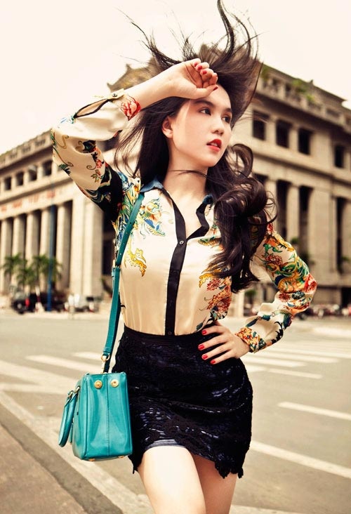 | Ngọc Trinh với sơ mia lụa in hoa văn mix kèm chân váy ôm sát gợi cảm. |