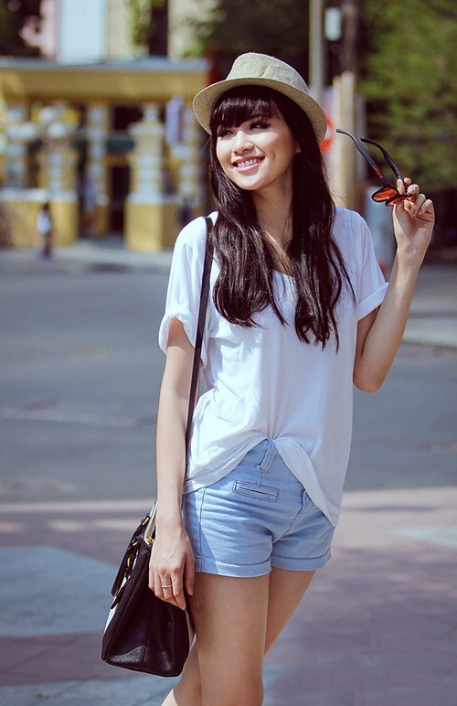 | Áo thun trắng được DIễm Hương mix trẻ trung với quần short và mũ fedora khi xuống phố. |