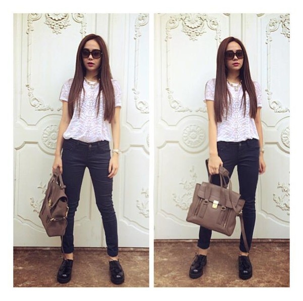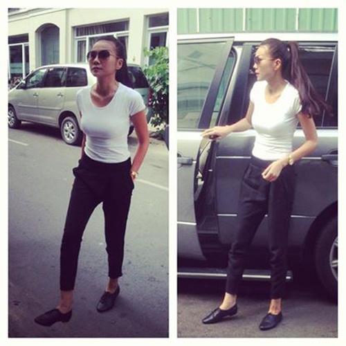 | Thanh Hằng mix áo thun ôm cổ điển với quần âu và giày oxford trẻ trung. |
