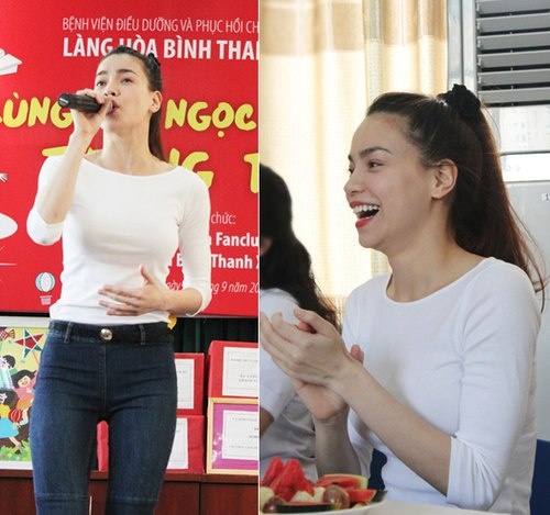 | Hà Hồ kết hợp áo thun cổ thuyền với quần skinny rất trẻ trung. |